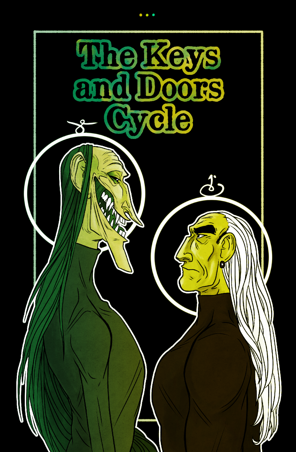 The Keys and Doors Cycle is 124 pages of surreal horror and romance; it follows two characters through four different and strange lifetimes as they endlessly discover and remember their love for each other. Featuring: nonbinary characters, scary mermaids, astronauts, priests and ministers, old married couples, angels, big teeth, kisses, terrifying hellscapes, and lots of long beautiful hair and lovingly-rendered frown lines.